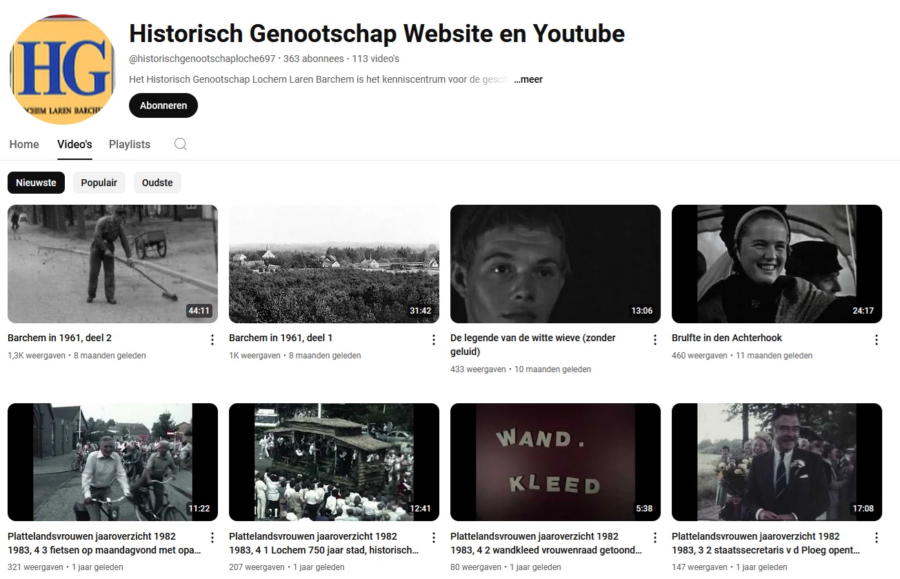 Filmarchief Het Historisch Genootschap bezit onder andere de films, gemaakt door de voormalige Smalfilmclub Lochem en de Achterhoekse Smalfilm Amateurs. Daarnaast omvat de collectie films van particulieren en verenigingen en van de firma Adolfs, die zowel in Lochem, Laren als Barchem straatbeelden opnam. Het beheer van de films is overgedragen aan het Regionaal Archief Zutphen en opnieuw professioneel gedigitaliseerd. De onbewerkte versies zijn te bekijken via de site van Erfgoed Zutphen, waar ook beschrijvingen van de inhoud te vinden zijn. Daarnaast maakten we van de meeste films kortere of bewerkte versies. Die zijn te bekijken via ons Youtube kanaal.
