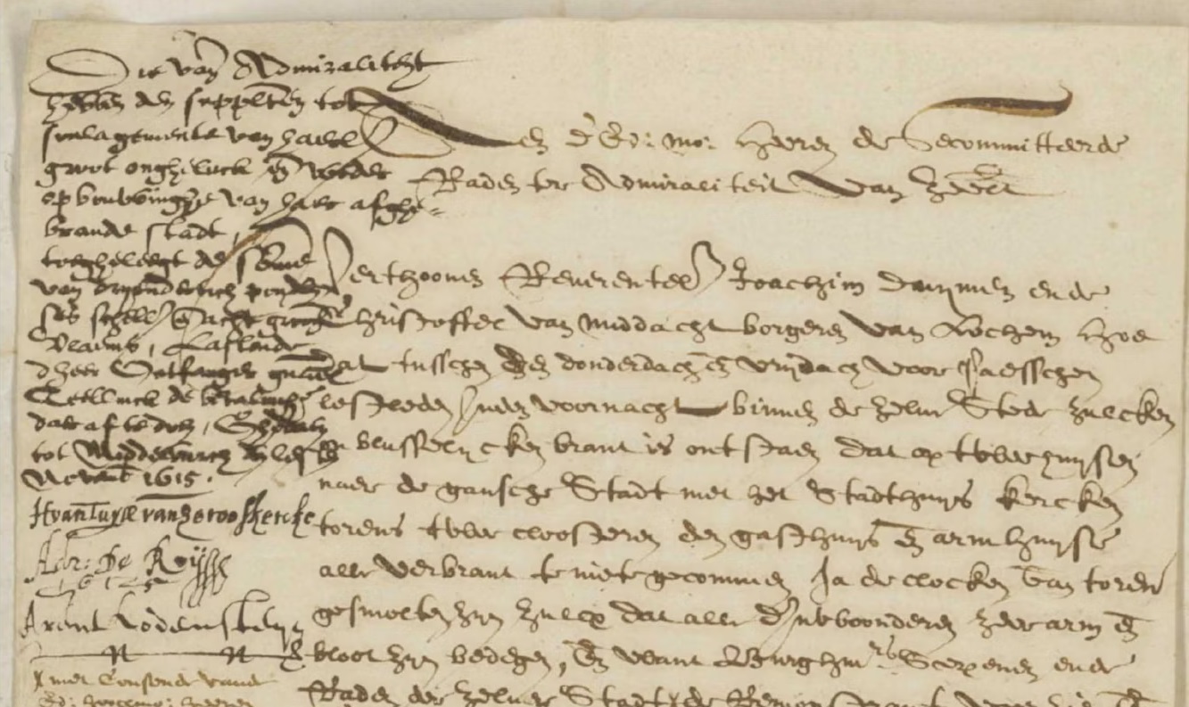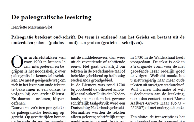 Paleografie Paleografie is het omzetten van oude, handgeschreven teksten naar getypte letters. Een tweede doel is om woorden en/of begrippen, die nu niet meer gangbaar zijn, te verduidelijken. Al in het allereerste nummer van Land van Lochem schreef Henriëtte Marsman hierover een artikel. De werkgroep Paleografie die op gezette tijden op de Veldmaat bijeenkomt doet dit om met name handschriften vanaf de 16e eeuw voor iedereen leesbaar en daarmee toegankelijk te maken. Uit een brandbrief aan de staten van Zeeland om een bijdrage aan het herstel van Lochem na de grote brand van 1615. Voorbeelden van andere projecten: uit 1703: een aantal documenten, waarin de zonen van sergeant-majoor Balochi worden aangeklaagd vanwege het oplichten van een aantal kooplieden, die onderweg waren van Deventer naar Koesfelt. uit 1814: een aantal documenten, waarin een conflict wordt uitgevochten tussen een markebestuur en een aantal boeren over oude rechten van een route waarover zij hun vee zouden mogen drijven.